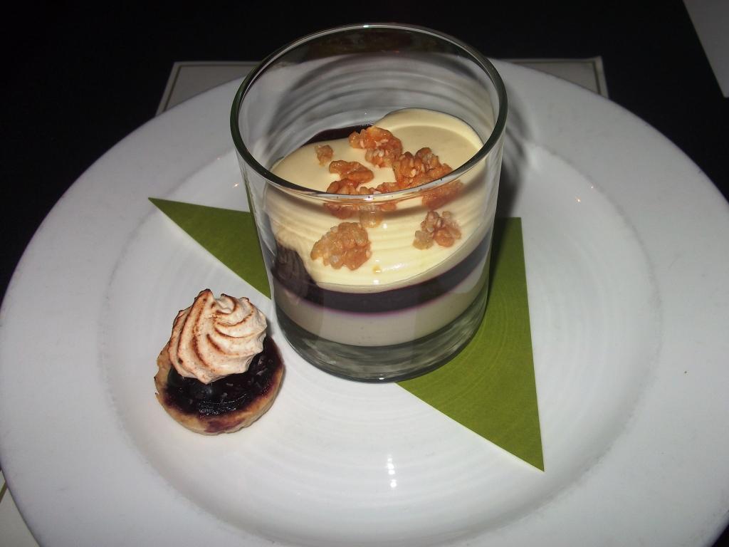 Dessert was a Yuzu Panna Cotta that featured wild Maine blueberries, passion fruit crème, toasted caramel crunch accompanied by a Blueberry crumble tart topped with a coconut meringue served with a 2004 Mer Soliel ‘late” from the Santa Lucia Highlands. I have to admit that I have never been a huge blueberry fan – but there was something about this dish, or the culinary geniuses that created it, that changed my mind. The combination of the passion fruit crème and the pop of the whole blueberries did something amazing in my mouth.