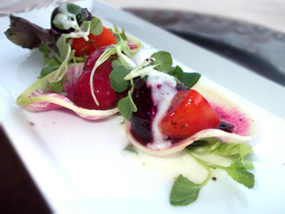 Soon, a gorgeous Beet Salad (Roasted & Pickled Red, Golden & Candy Striped Baby Beets with Shaved Radish and Organic Yogurt Dressing | $14) made its way to our table.