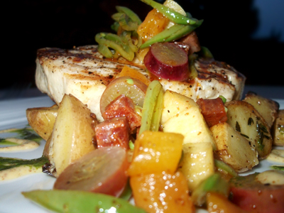 Amy: I received the special of the evening – a beautiful piece of Swordfish atop tomatoes and surrounded by a salad of pineapple, chorizo, apple, grilled grapes, fingerling potatoes, diced carrots and ginger. The dish was finished with a sherry cream sauce that was spectacular. I ate more of this dish than I was hungry for, but I just couldn’t put my fork down – it was fantastic. Not to mention, the plating and use of color was fun and playful. This dish made my night.