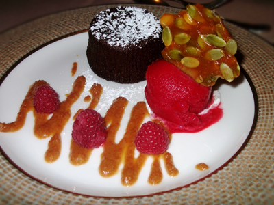 Amy: I should mention that the portion size at Yavapai is quite larger than we were used to. We weren’t sure that we could put down another bite, but dessert looked too indulgent to pass up. On my side of the table: a warm, flourless Chocolate Lava Cake that was the BEST I’ve ever tasted, accompanied by a raspberry-juniper sorbet, pumpkin seed brittle and pumpkin caramel sauce. My attention was immediately on the lava cake that didn’t stand a match against me. The sorbet was made in-house and was fabulous. The only component I wasn’t feeling as much as the others was the pumpkin caramel sauce, perhaps because I’m not used to pumpkin at this time of year. Overall, the dessert plate was a winner.