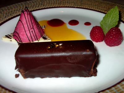 Taryn: I was served a “Special Occasion” dessert which was comprised of a Chocolate wafer topped with a chocolate ganache and gold leaf accompanied with a raspberry coulis and passion fruit puree. I have to be upfront and say that I am not the biggest chocolate fan. Every now and then a little bit will do me just fine so this was death by chocolate for me. For a die-hard choc-o-holic this would have taken you to another-worldly place. It was delicious and very, very rich! I loved the coulis and puree as it helped soften the richness of the chocolate.
