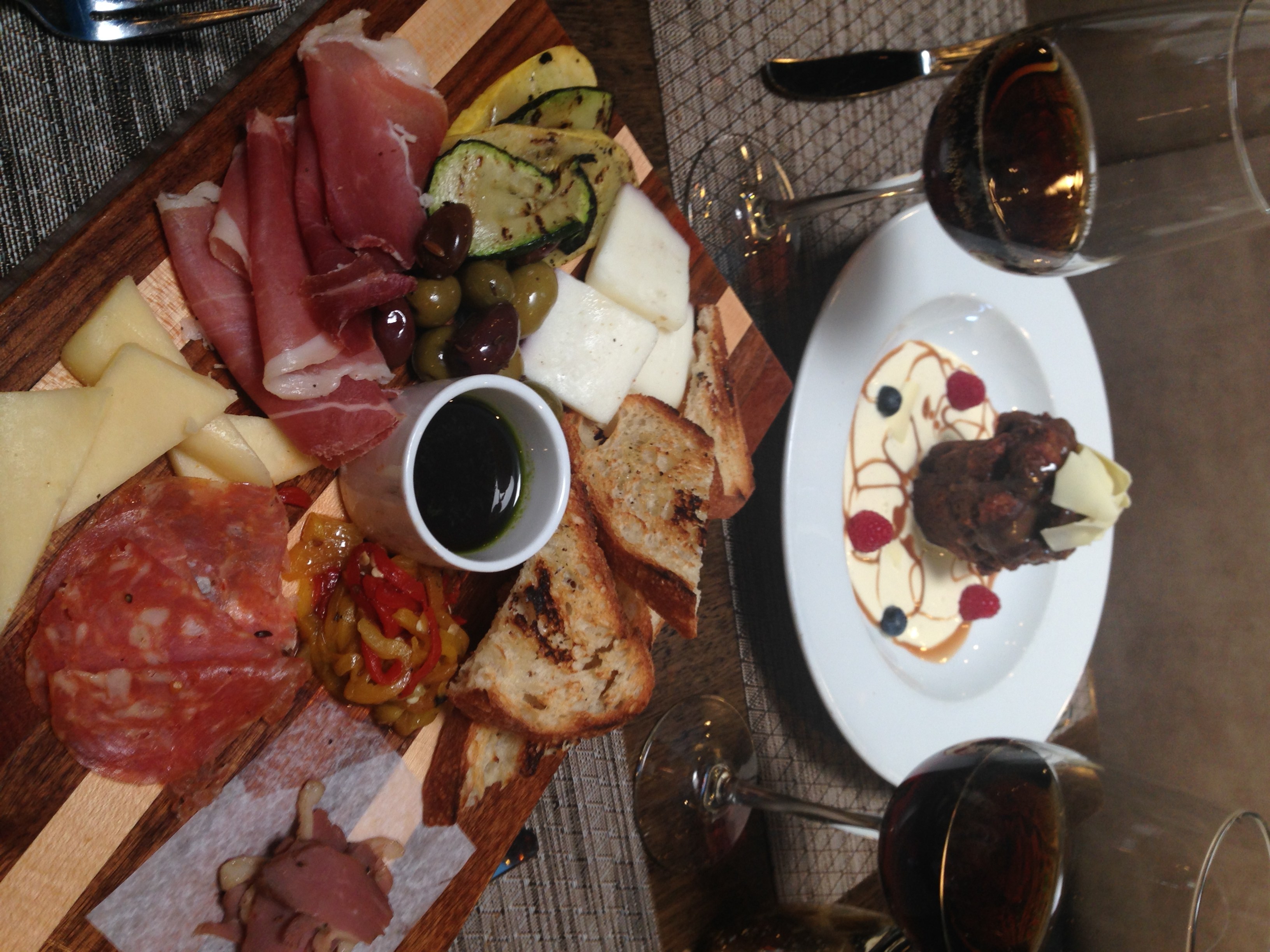 You’ll be able to nosh on a large kitchen board brimming with meats, cheeses, roasted veggies and olives. You also will get to share one dessert.